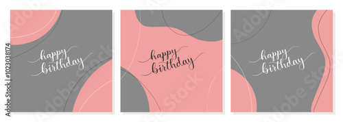 Fototapeta premium Happy Birthday cards set, pink and gray color posters, lettering with hand drawn letters. Abstraction in boho style.