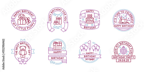 Obraz premium Happy Birthday celebration logos, labels, icons. A set of 8 birthday logotypes. Birthday Party, Birthday Gift Cake, Balls. Ideal for greeting cards, party invitations, events. Vector illustration.