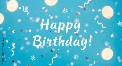 Fototapeta premium Happy Birthday Celebration with Blue Background Confetti Snowflakes and Light Bokeh