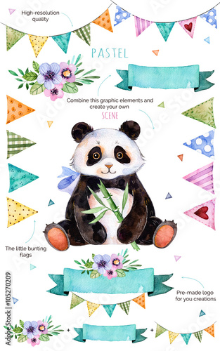 Fototapeta premium Happy Birthday collection!Pattern with individual elements for your own design:flowers,bunting flags,cute panda,bouquets,garlands,ribbons,Perfect for birthday cards,mother's day,baby cards,invitation