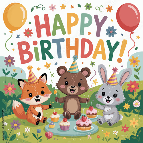 Naklejka premium Happy Birthday forest party with fox bear and bunny celebration