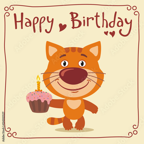 Naklejka premium Happy birthday! Funny kitten cat with birthday cake. Greeting card with...