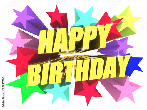 © Alex_Po, Fototapeta premium Happy Birthday golden text among bright multicolored stars. 3d render
