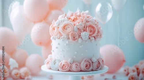 Fototapeta premium Happy birthday greeting and Birthday cake and inflatable balloons,invitation card template,congratulations,Festive cake concept.