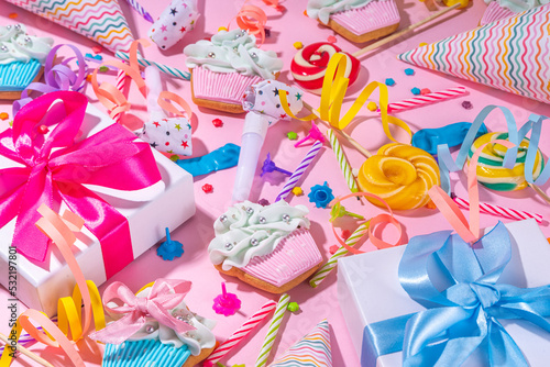 © ricka_kinamoto, Fototapeta premium Happy birthday greeting card background. Flatlay with colorful holiday tools - birthday party caps, blowers, gift boxes , balloons, steamers, candles, on pink background copy space