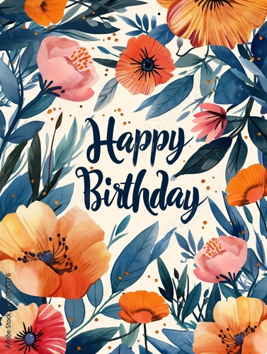 © Benjamin, Fototapeta premium Happy Birthday greeting card with flowers