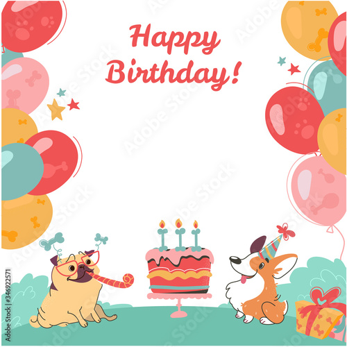 © Анна Канищева, Fototapeta premium Happy birthday greeting card with funny dogs. Pug and corgi, cake, gifts, colorful balloons on isolated white background. Vector poster in cartoon style,.with an festive inscription.