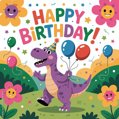 Fototapeta premium Happy birthday greeting with a purple dinosaur and smiling flowers...