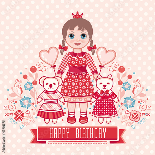 Fototapeta premium Happy birthday - greetings card for girl . Illustration of cute little princess.