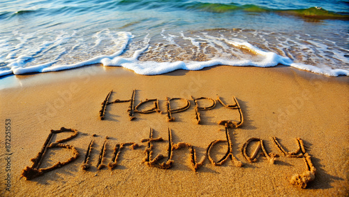 © PETR BABKIN, Fototapeta premium Happy birthday! - Inscription on the beach sand.