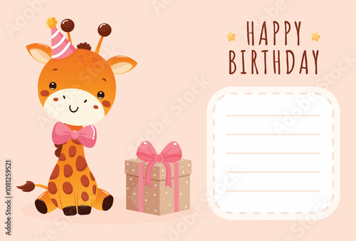 Fototapeta premium Happy Birthday postcard design with cute giraffe and copy space place for text