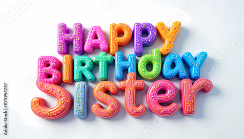 © khiyalee, Naklejka premium Happy Birthday Sister. 3D HD Letters for wishing in vibrant colours, candles, sweets, glitter, and candies letters for the birthday celebration. isolated on a white background.