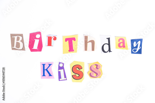 Obraz premium Happy Birthday symbol. Concept words Birthday Kiss isolated on clean white background in fun cut out newspaper style typescript. Concept birthday celebration.