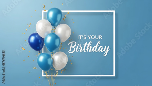 © FARIHA, Naklejka premium Happy birthday wishes with blue and white balloons