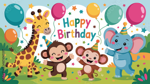 Naklejka premium Happy Birthday with Giraffe, Monkeys, and Elephant Party celebration animals