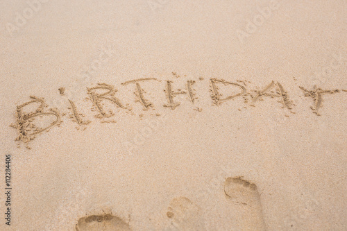 Fototapeta premium happy birthday written on the sand beach