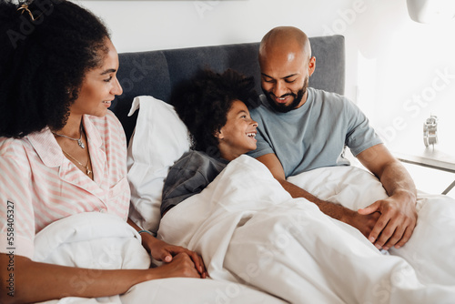 Obraz premium Happy black family with little boy smiling while lying together in bed