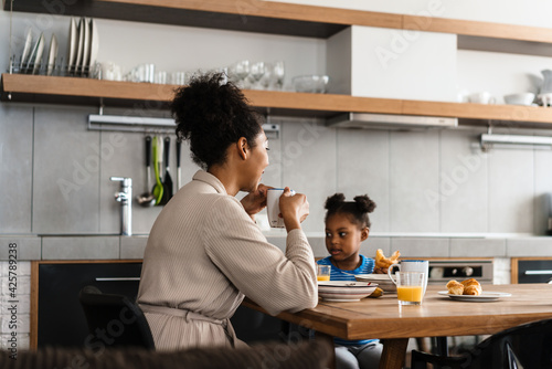 © Drobot Dean, Obraz premium Happy black mother and daughter having breakfast at home kitchen