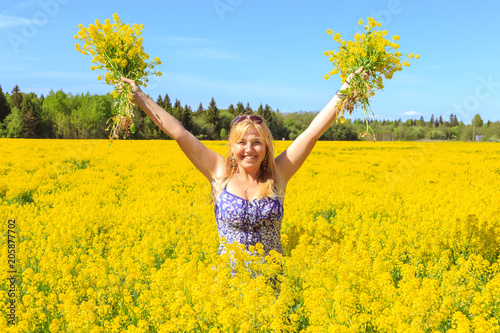 © lizavetta, Naklejka premium Happy blonde enjoys nature in a yellow field.