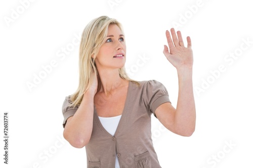 © WavebreakMediaMicro, Obraz premium Happy blonde holding up her hand