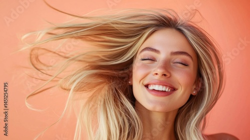 Fototapeta premium Happy Blonde Woman with Flowing Hair Against Peach Background
