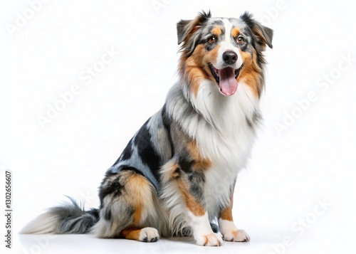 © Sirinporn, Fototapeta premium Happy Blue Merle Aussie Shepherd Dog Sitting, Panting, Isolated on White Background