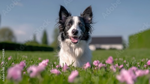 © Narongsag, Fototapeta premium Happy Border Collie Dog in Spring Meadow Pet Puppy Flowers
