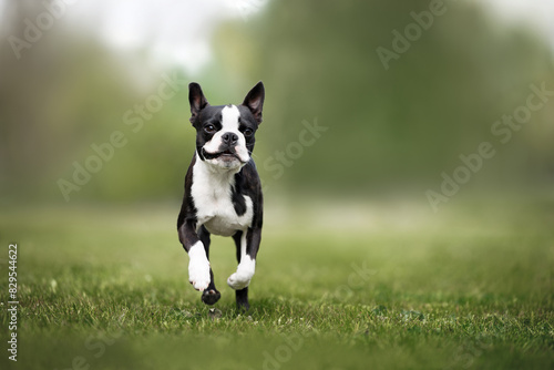 Fototapeta premium happy boston terrier dog running on green grass outdoors in summer