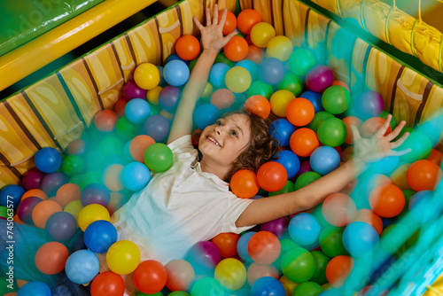 Obraz premium Happy boy child playing in basin filled with multi colored plastic ball