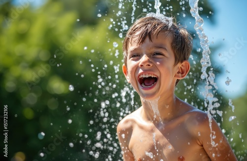 © Vadym, Obraz premium Happy boy laughing as water splashes him. Child enjoys summer day outdoors. Playful kid smiling, having fun. Summer vacation, water fun activities, splash, wet, refreshing.