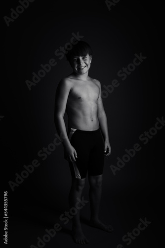 © Juan Garcia, Naklejka premium Happy boy posing with bathing suit, black and white studio photography