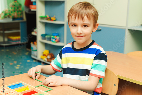 Fototapeta premium Happy boy sits at the desk at classroom. Kid using colorful sticks and...