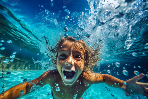 Fototapeta premium Happy boy swimming underwater in the ocean. Kid having fun underwater.