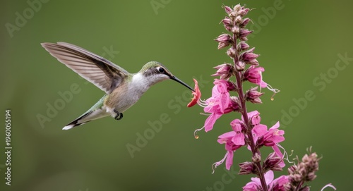 Naklejka premium Happy broad tailed hummingbird mid flight enjoying nectar from striking penstemon flowers