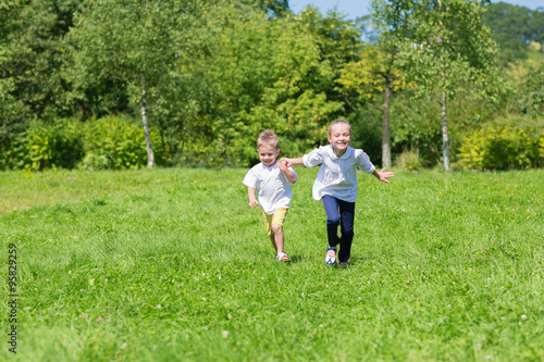 © Stanislav Komogorov, Obraz premium Happy brother and sister running on the grass