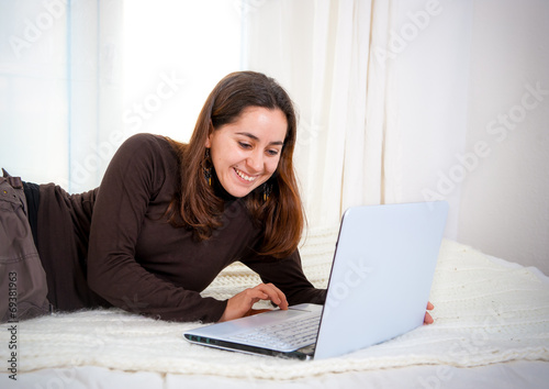 Fototapeta premium happy brown hair latin woman working on her laptop