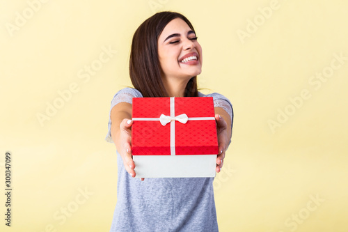© Graphicroyalty, Fototapeta premium Happy brunette woman in casual holding gift box and looking at the camera while enjoys over yellow background. Young woman hold gift in christmas style
