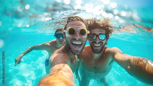 Naklejka premium Happy buddies are posing for a selfie in the sea with the backdrop of blue,...