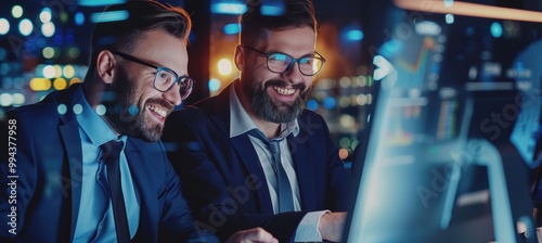 © Oleksandr, Fototapeta premium Happy business leaders discussing digital strategy on a computer screen in a modern office