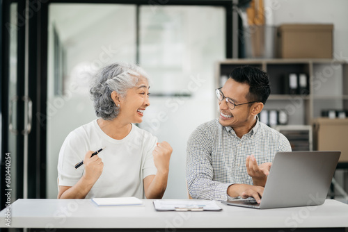 Fototapeta premium Happy business owners smiling at sales success after checking profits from home office online store, concept of online commerce and e-commerce.