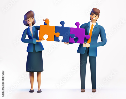 Obraz premium Happy business people working with puzzle pieces. 3D rendering illustration.