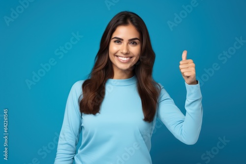 Fototapeta premium Happy businesswoman showing thumb up over blue background. Wearing in blue shirt and Looking at camera.