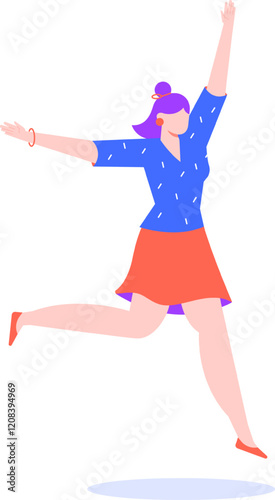 Fototapeta premium Happy businesswoman with purple hair is jumping and celebrating success with arms up, expressing joy and excitement, depicting achievement and positive emotions