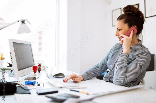 Obraz premium Happy businesswoman working at her desk