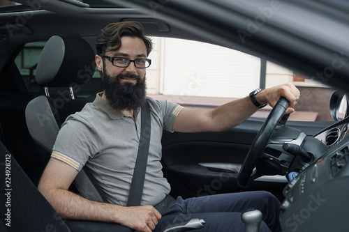 © arthurhidden, Obraz premium Happy car driver with fastened seat belt
