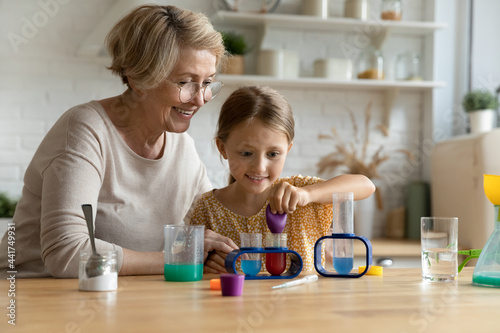Fototapeta premium Happy caring middle aged older grandmother doing chemical tests with joyful candid little preschool grandchild in modern kitchen. Smiling curious kid girl studying with pleasant granny in kitchen.