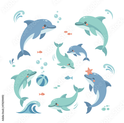 © ProVector, Naklejka premium Happy cartoon dolphins playing in ocean water