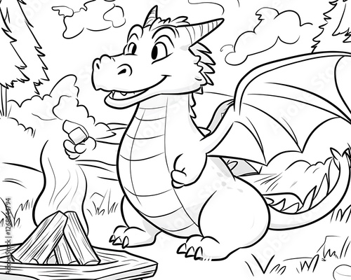 Obraz premium Happy Cartoon Dragon Holding Marshmallow by Campfire in Forest Scene