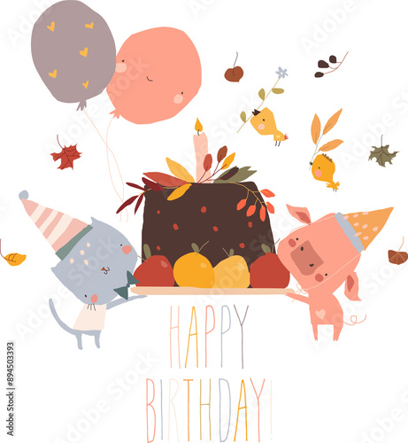 © Maria Starus, Naklejka premium Happy Cartoon Friends Animals celebrating Autumn Birthday. Vector Illustration