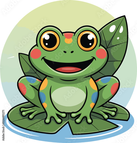Obraz premium Happy Cartoon Frog Sitting On Leaf With Vibrant Colors